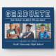 Classic 3 photo graduation plaque display sign with easel features Graduate in bold serif lettering with modern custom text that can be fully customised with the graduate's full name, class year, and school name. Add three favourite pictures of the graduate to the square placeholder images. Navy blue background colour can be modified.