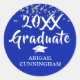 Modern royal blue, white and silver graduation party favour stickers or envelope seals featuring brush hand-lettered Class Year GRADUATE and silver glitter confetti and white graduation cap or mortarboard against an editable royal blue or sapphire blue background and personalised with your graduate's name. CHANGES: Change the background colour and/or change the text font style, size, colour or placement by clicking on CUSTOMIZE FURTHER in the PERSONALIZE section. ASSISTANCE: For help with design modification or personalisation, colour change, transferring the design to another product or you would like coordinating items, contact the designer BEFORE ORDERING via the Zazzle Chat MESSAGE tab or email makeitaboutyoustore@gmail.com.
