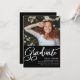 Elegant and modern graduation party invitation template for high school or college graduates! The typography font says "graduate" in modern script font against the black background. Customise this product by adding the graduate's name, school, the party information, and your own photo. On the back is another picture with a simple message on your accomplishments, gratitude, and what's happening to you now that you are graduating.