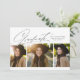 This three photo graduation announcement and invitation is the perfect way to celebrate your graduate. With an modern and elegant script "graduate" in black and underlined, this design also features room for personalisation including name, school and year. The back is a stylish black with a subtle dash pattern to match the underline on the front and includes room for graduation party invitation text. This stylish graduation announcement works well for a high school graduate or a college graduate. Other colours and styles available in the collection by Lea Delaveris Design. Also available as a digital download.