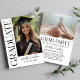 Modern black and white graduation invitation featuring a bold vertical “Graduate” design with a full photo on the front. Personalise with the graduate’s name and class year for a clean, editorial look. Backside includes a photo header plus coordinating grad party details in crisp black type on white.