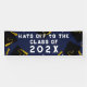 Creative graduation congratulations banner featuring black and gold graduation caps on navy blue background. Edit text to change senior class year.