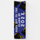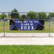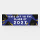 Creative senior class of 24 graduation congratulations party banner featuring classic black and gold graduation caps on blue background. Edit text to change year.