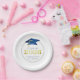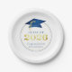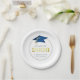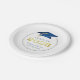 Elegant personalised graduation CLASS OF 2025 graduation party paper plates featuring faux metallic blue and gold graduation cap and year with your custom text (shown with CONGRATULATIONS NAME) in blue. ASSISTANCE: For help with design modification or personalisation, colour change, resizing, transferring the design to another product or if you would like coordinating items, contact the designer BEFORE ORDERING via the Zazzle Chat MESSAGE tab or email makeitaboutyoustore@gmail.com.