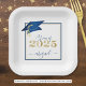 Modern personalised CLASS OF 2025 blue, gold and white graduation party plates with your graduate's name in a chic handwritten script with faux metallic blue graduation cap and faux metallic gold 2025. ASSISTANCE: For help with design modification/personalisation, colour change, transferring the design to another product or would like coordinating items, contact the designer BEFORE ORDERING via Zazzle Chat or makeitaboutyoustore@gmail.com.