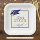 Modern personalised CLASS OF 2025 navy blue, gold and white graduation party plates with your graduate's name in a chic handwritten script with shimmering faux metallic navy blue graduation cap and faux metallic gold 2025. ASSISTANCE: For help with design modification/personalisation, colour change, transferring the design to another product or would like coordinating items, contact the designer BEFORE ORDERING via Zazzle Chat or makeitaboutyoustore@gmail.com.