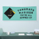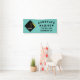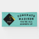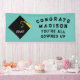 Creative high school or college graduation congrats party banner for senior class grad featuring classic black and gold cap on teal blue background.