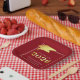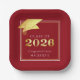 Elegant personalised custom colour CLASS OF 2025 graduation party paper plates with CONGRATULATIONS and your graduate's name accented with a faux metallic gold foil 2024 and graduation cap or mortarboard in your choice of background colour (shown in red) you can change to a school colour or coordinating party theme colour. ASSISTANCE: For help with design modification/personalisation, colour change, transferring the design to another product or would like coordinating items, contact the designer BEFORE ORDERING via Zazzle Chat or makeitaboutyoustore@gmail.com.
