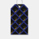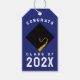 Creative graduation congrats gift tags, featuring black cap with gold tassel on a blue background. Edit text to add year.