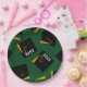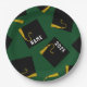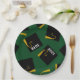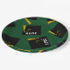 Creative green graduation party plates featuring black and gold graduation caps. To personalise edit text to add name of grad and senior class year.