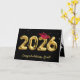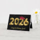 Gold foil balloons for 2026 graduation on a black background with a red cap and gold confetti.