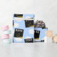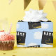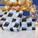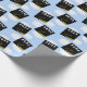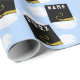 Creative graduation gift wrap and grad party decoration featuring black and gold graduation caps on blue sky background. To personalise edit text to add grad's name and senior class year.