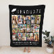 Elegant black graduation keepsake blanket to celebrate the graduate featuring "GRADUATE" across the top in large white lettering, a white illustration of a graduation cap, a 30 photo collage to commemorate their family, friends and achievements, and their name, class year and school in classic white serif typography.