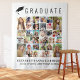 Modern white graduation party photo booth backdrop to celebrate the graduate featuring "Graduate" across the top in large typography, a grad cap, a 30 photo collage to commemorate their family, friends and achievements, and their name, class year and school..