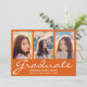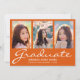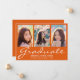 Send your family and friends a unique personalised photo collage graduation card to wow them. This modern template design features three photos for you to change to your own framed in red orange. Below your photos is the word "Graduate" in white modern handwritten script typography and your name and details to personalise. The back of the card is orange. Designed by artist ©Susan Coffey.