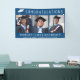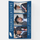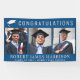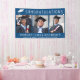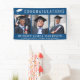 Elegant classic blue graduation party welcome banner and photo backdrop prop to celebrate the graduate featuring "Congratulations" in large white typography and an illustration of a graduation cap on top, a three photo collage and his or her name, class year and school name in modern white typography. The background and text colours can be edited to match your school colours by selecting "customise further."