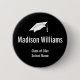 A graduate's cap is above the customizable graduate's name. You can also edit the text to show the class year and school name. White text appears on this black graduation button.