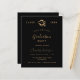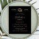 A modern, elegant graduation party invitation. A black background decorated with a gold cap. Personalise and add a name, year and details. Golden letters.
