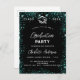 A modern, elegant graduation party invitation. A black background decorated with green, teal faux glitter, sparkles. Personalise and add a name, year and details.