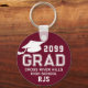 Create a personalised and monogrammed graduation keepsake keychain commemorating a graduate's accomplishment. The design features a graduation cap, class year, the title GRAD, your custom text and their monogram--all in your choice of colours (shown in all white on a burdundy maroon background). All text and graphic colours can be changed in EDIT. The design is duplicated on the back side so be sure to make the same changes on each side. ASSISTANCE: For help with design modification or personalisation, colour change, resizing or transferring the design to another product, contact the designer BEFORE ORDERING via the Zazzle Chat MESSAGE tab or email at makeitaboutyoustore@gmail.com.