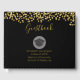 A guestbook which says Class of 20xx and the graduate's name and school, written in a gold colour. Designed with a black graduation cap surrounded by a semi-transparent white circle. The top edge is diecorated with fake gold glitter confetti. Black background with gold lettering is simple yet stylish.