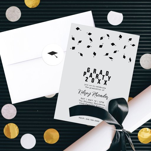 Featuring a festive scatter of graduation cap confetti paired with bold, modern typography announcing the party details.