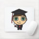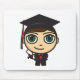 A graphic illustration of a graduation male student with big green eyes, brown hair, black cap and certificate