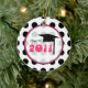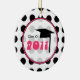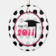 A graduation ornament featuring a background of black polka dots over white. Design inside sheer circle outlined in pink reads "Class of 2011" and features a graduation cap.