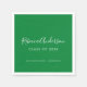 This stylish graduation napkin offers a minimal design on a green background. The name appears in a popular handwritten style text and plain text for the graduating year and school. The green background and can be changed to any color by choosing customize.