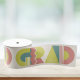 Retro-style graduation gift wrapping ribbon that features the word "GRAD" designed with geometric shapes in various colors. Retro colors—pink, and green—add to the retro style. Perfect for class of 2026 graduation day gifts.