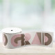 Retro-style graduation gift wrapping ribbon that features the word "GRAD" designed with geometric shapes in various colors. Retro colors—pink, and brown—add to the retro style.