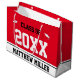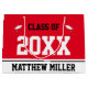 This red, black, and white gift bag says 'Class of 20xx' in large text. (You can change the year if you need to.) At the bottom, there's black text you can change to show the correct name for the graduate. White graduate's caps are on either side of the phrase "Class Of".