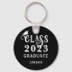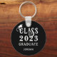 Commemorative custom colour graduation keychain personalised with name, school or other text and CLASS OF YEAR GRADUATE in retro decorative typography. All text, the graduation cap graphic and background colours are editable to change to school colours or a favourite colour (shown in white on black). ASSISTANCE: For help with design modification or personalisation, colour change, resizing, transferring the design to another product or if you would like coordinating items, contact the designer BEFORE ORDERING via the Zazzle Chat MESSAGE tab below or email makeitaboutyoustore@gmail.com.