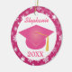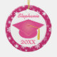 Personalised School Class ornament for Christmas or as a keepsake gift has place for you to add a custom name and graduation class date. Pink snowflake background and pink grad hat for high school and college female graduates. One sided ceramic ornament that makes a lovely Christmas gift, stocking stuffer, graduation present, car hanger, gift tie-on or memory gift.
