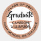 Add an elegant personalised touch to college or high school graduation announcements and invitations with these modern calligraphy round stickers / envelope seals. Design features a copper faux foil graduation cap mortar board, and stylish black typography graduate name, school, and class year. Makes a chic customised addition to graduation party favours and decorations. As an option, change the curved text to a name and address for use as round return address labels on invites or thank you notes.