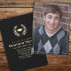 This design features a graduate graduation classic photo, a classic elegant modern minimalist simple, a mortarboard laureate laurel leaves, for a high school or college senior, a black and gold modern class of your year, a traditional mortarboard tassel cap, a classy graduation grad party invitations, a simple graduation photo announcements, with school colours white text typography, a graduation announcement cards