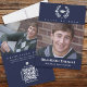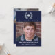 This design features graduate graduation classic photo, a classic elegant modern minimalist simple, a mortarboard laureate laurel leaves, for a high school or college senior, a navy blue modern class of, a traditional mortar board tassel cap, a classy graduation grad party invitations, a simple graduation photo announcements, with school colours white text typography, a graduation announcement cards