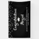 Silver confetti and editable title CONGRATULATIONS (graduate's name) in a handwritten brush script font in white against an editable black background that you can change to coordinate with school or party theme colours by clicking on the CUSTOMIZE FURTHER tab. Contact the designer if you'd like this design modified, on another product or desire complementary items for your event.