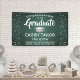 Add a personalised touch to college or high school graduation party decorations with this custom dark green, white and silver banner. All text is simple to customise to include name, class year, school, degree, honours, inspirational quote, or other text of your choice. Design features a green brushed background, faux stainless steel mortar board cap, festive grey and white confetti dots, stylish modern typography, and handwritten style script calligraphy. Please note that silver is printed colour, not metallic foil. This party sign is an elegant way to celebrate the special day. Congratulations to the graduate!