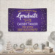 Add a personalised touch to college or high school graduation party decorations with this custom purple and gold yellow banner. All text is simple to customise to include name, class year, school, degree, honours, inspirational quote, or other text of your choice. Design features a mortar board cap, festive confetti dots, stylish modern typography, and handwritten style script calligraphy. Please note that gold is printed colour, not metallic foil. This party sign is an elegant way to celebrate the special day. Congratulations to the graduate!