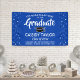 Add a personalised touch to college or high school graduation party decorations with this custom royal blue, white and black banner. All text is simple to customise to include name, class year, school, degree, honours, inspirational quote, or other text of your choice. Design features a blue background, black mortar board cap, festive confetti dots, stylish modern typography, and handwritten style script calligraphy. This party sign is an elegant way to celebrate the special day. Congratulations to the graduate!