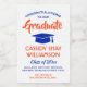 Add a  personalised touch to college or high school graduation party decorations with these elegant orange and blue mini wine bottle labels.  Design features a white background, blue mortar board cap, stylish modern typography, handwritten style script calligraphy, and a customisable message reading "Congratulations to our Graduate".  Text at the bottom includes class year, school name, and optional lines for degree, beverage type, or other info.  All text is simple to customise. These labels make a stylish graduation party drink idea and an elegant addition to the graduate's special day celebration. Cheers!