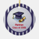 An image of a graduation hat and diploma with a navy border on a soft gray-blue background is best to give to anyone celebrating graduation. Send this card to the graduates and remember the past as you enter the new stage of life. Stripes on the background add a bit of fun.