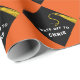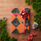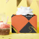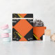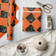 Creative orange graduation congratulations gift wrap and grad party decoration featuring class black cap and gold tassel. Edit text to add his or her name.