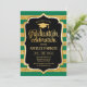 Graduation party invitation for men or women. Elegant invite card in green, black and gold. Modern simple design featuring stripes, a cap, faux glitter gold and typography script font. Perfect for a stylish graduation celebration.