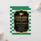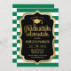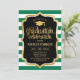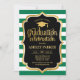 Graduation party invitation for men or women. Elegant invite card in green, black and gold. Modern simple design featuring stripes, a cap, faux glitter gold and typography script font. Perfect for a stylish graduation celebration.