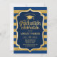 Graduation party invitation for men or women. Elegant invite card in navy blue and gold. Modern simple design featuring stripes, a cap, faux glitter gold and typography script font. Perfect for a stylish graduation celebration.