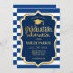 Graduation party invitation for men or women. Elegant invite card in navy blue, white and gold. Modern simple design featuring stripes, a cap, faux glitter gold and typography script font. Perfect for a stylish graduation celebration.