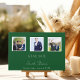 A green background. White coloured text. Personalise and add 3 photos, name, school name and year. For both him and her. The name on the front is written with a hand lettered style script.