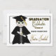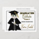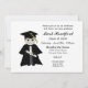 Graduation invitation with young man character wearing black cap and gown. Personalise the front and back